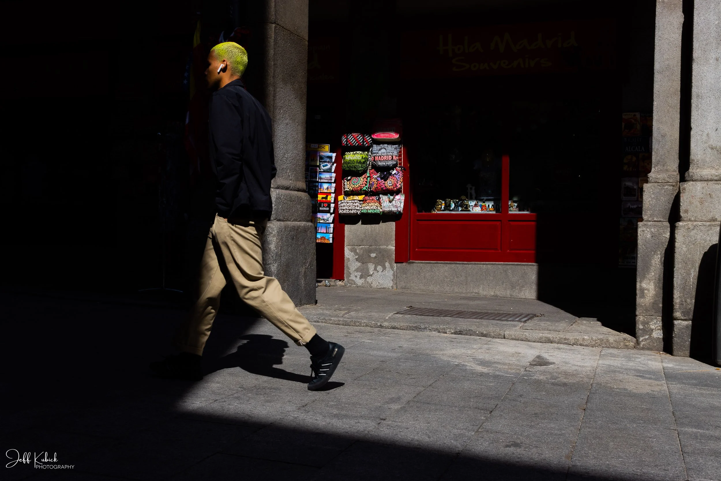 A person with bright yellow hair wearing a black jacket, beige pants, and black shoes walking past a souvenir shop with red window frames and colorful bags hanging outside.